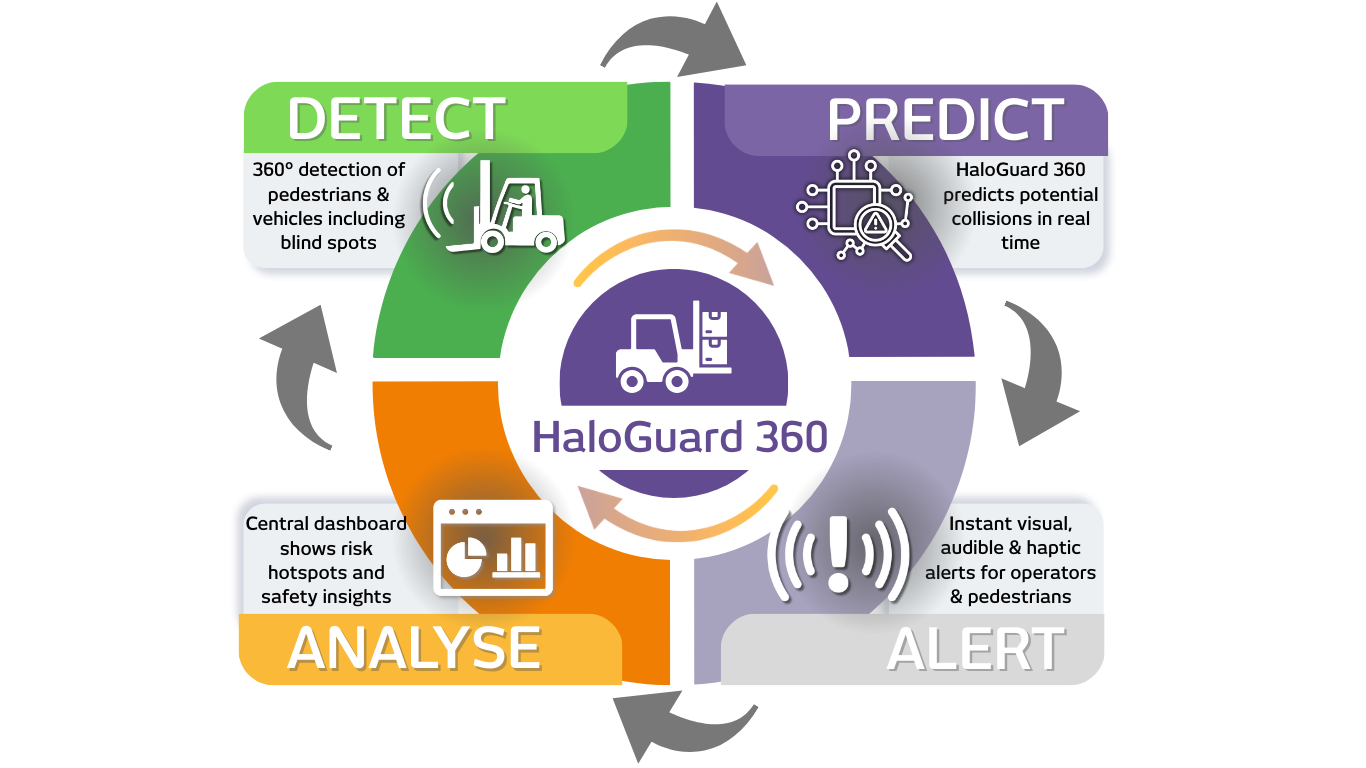 HaloGuard 360 uses ultra-wideband (UWB) proximity detection, real-time alerts, and data-driven insights to reduce collision risk, improve situational awareness and support safer vehicle operation across busy worksites.